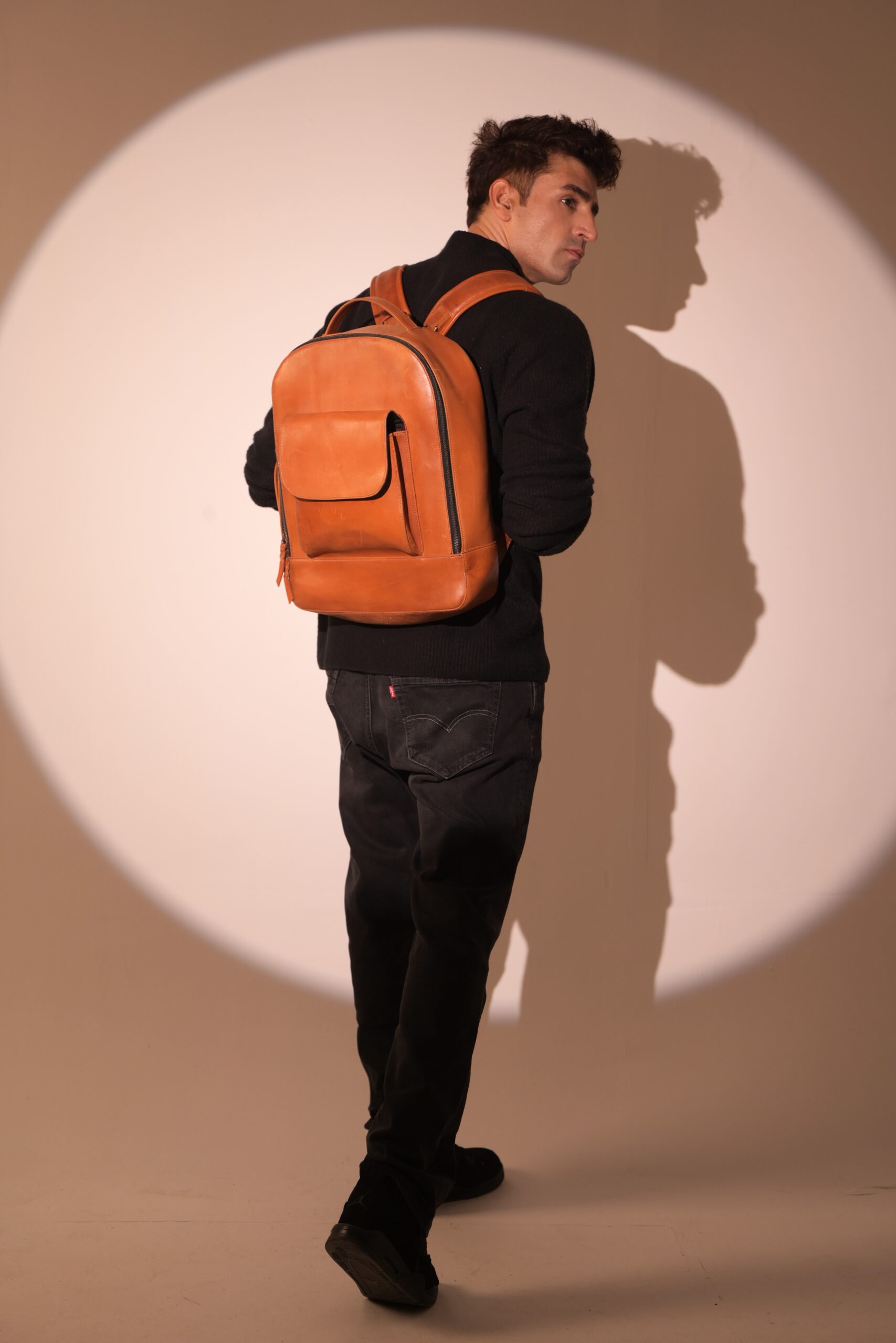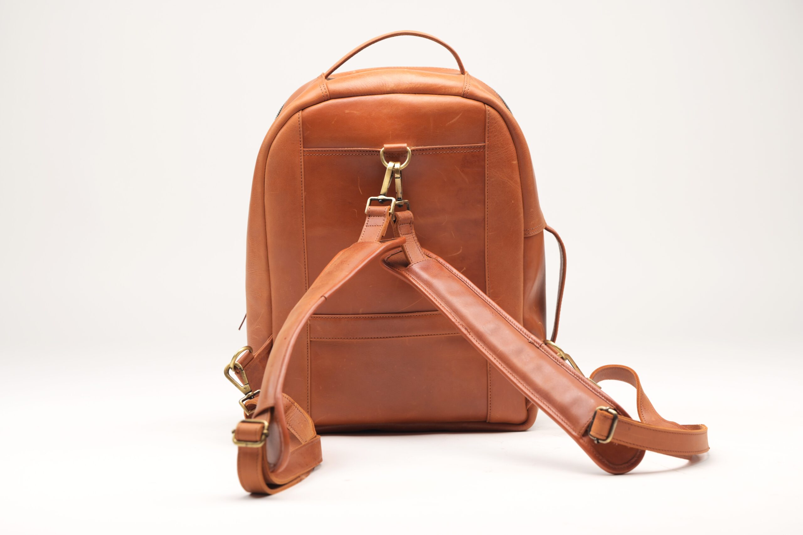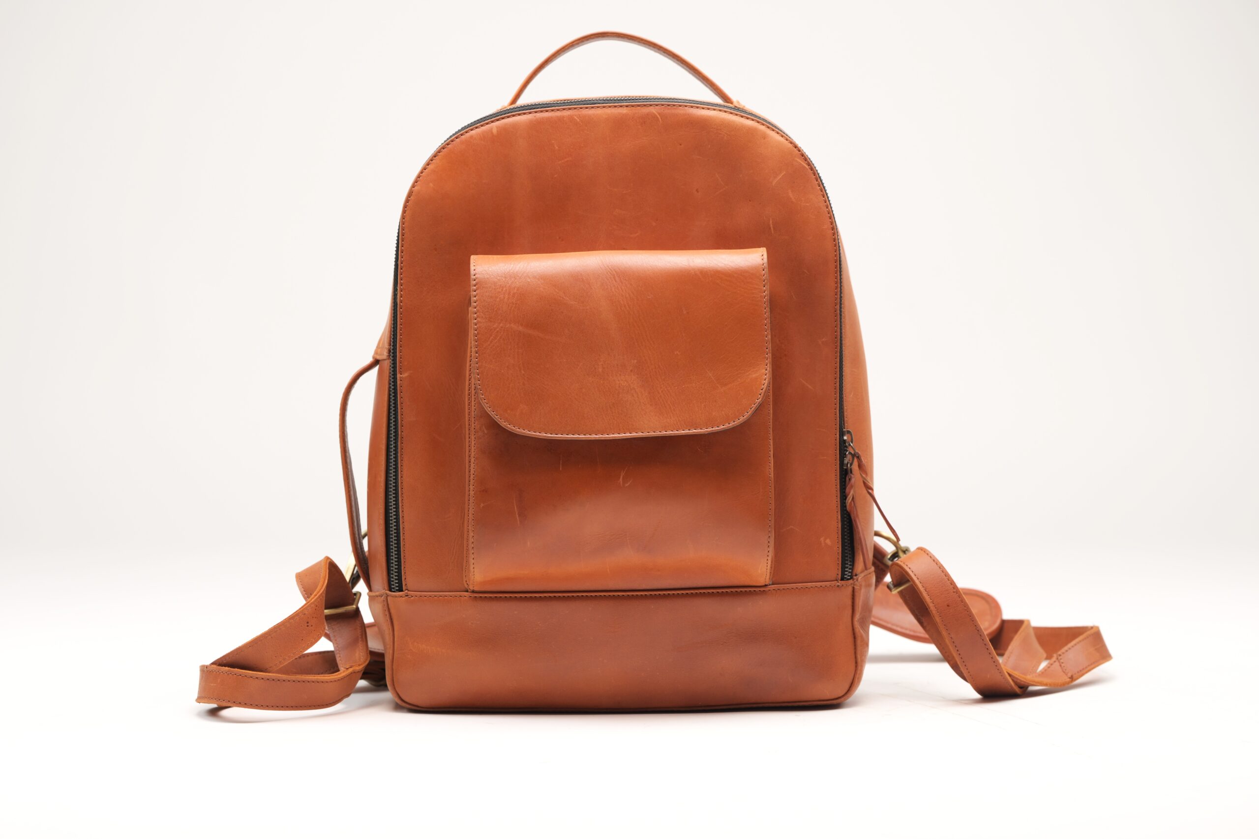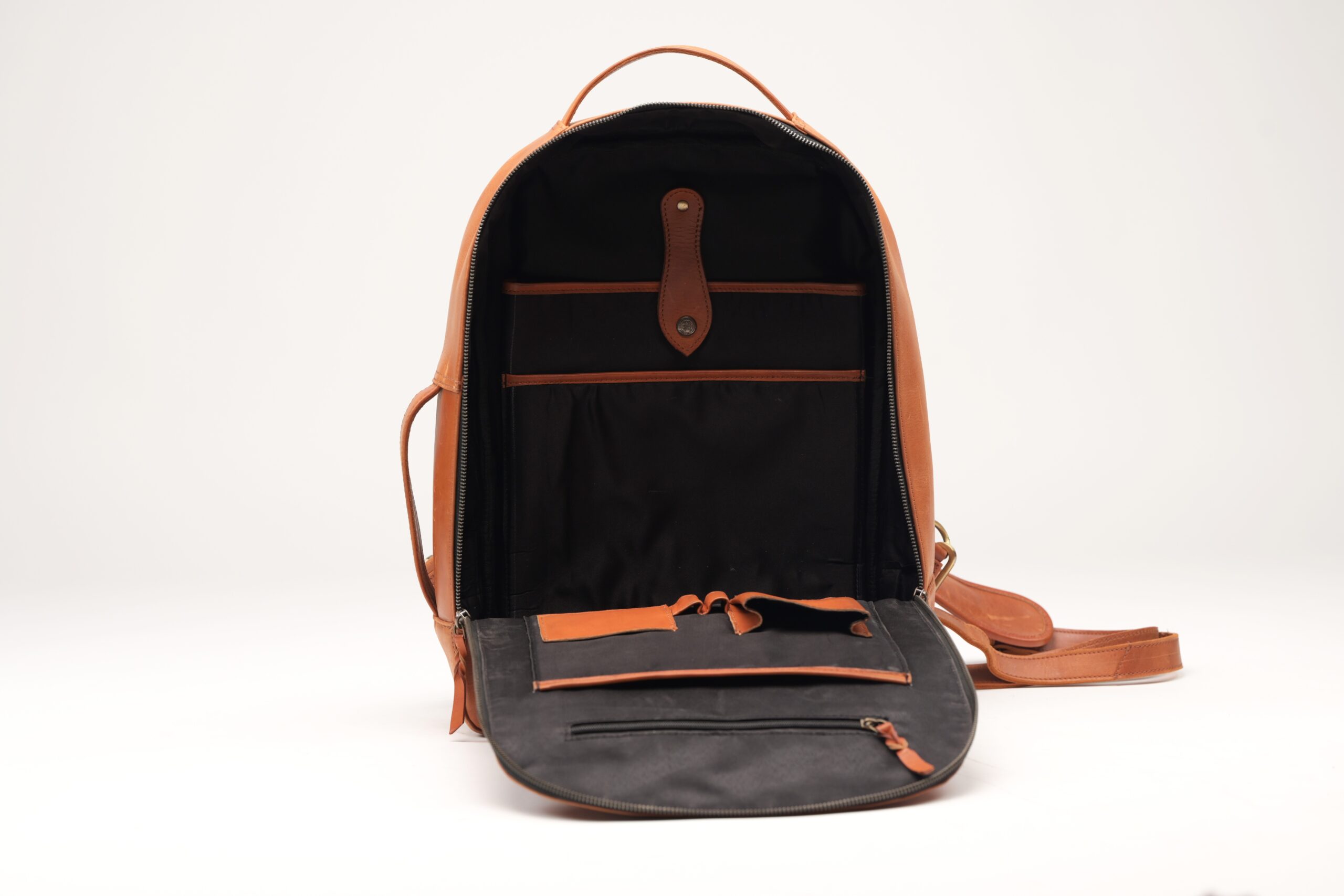 Versatile tan full-grain leather backpack with a dedicated laptop sleeve.