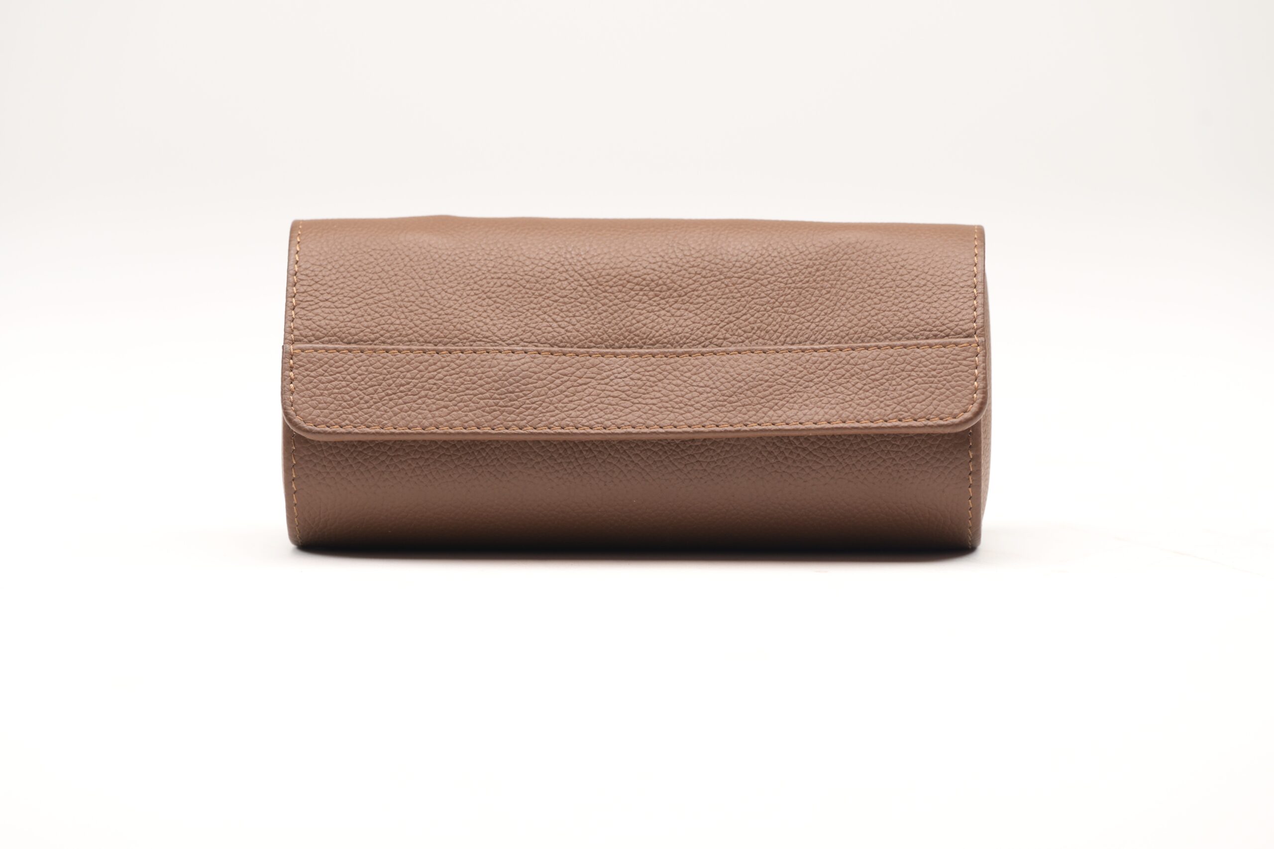 A refined watch case crafted from full grain cow leather in a light brown shade. The minimalist cylindrical design includes a smooth flap with gunmetal snap closures for secure sealing. Inside, a removable padded cushion holds up to three watches individually, preventing scratches and ensuring safe storage—ideal for both home and travel.