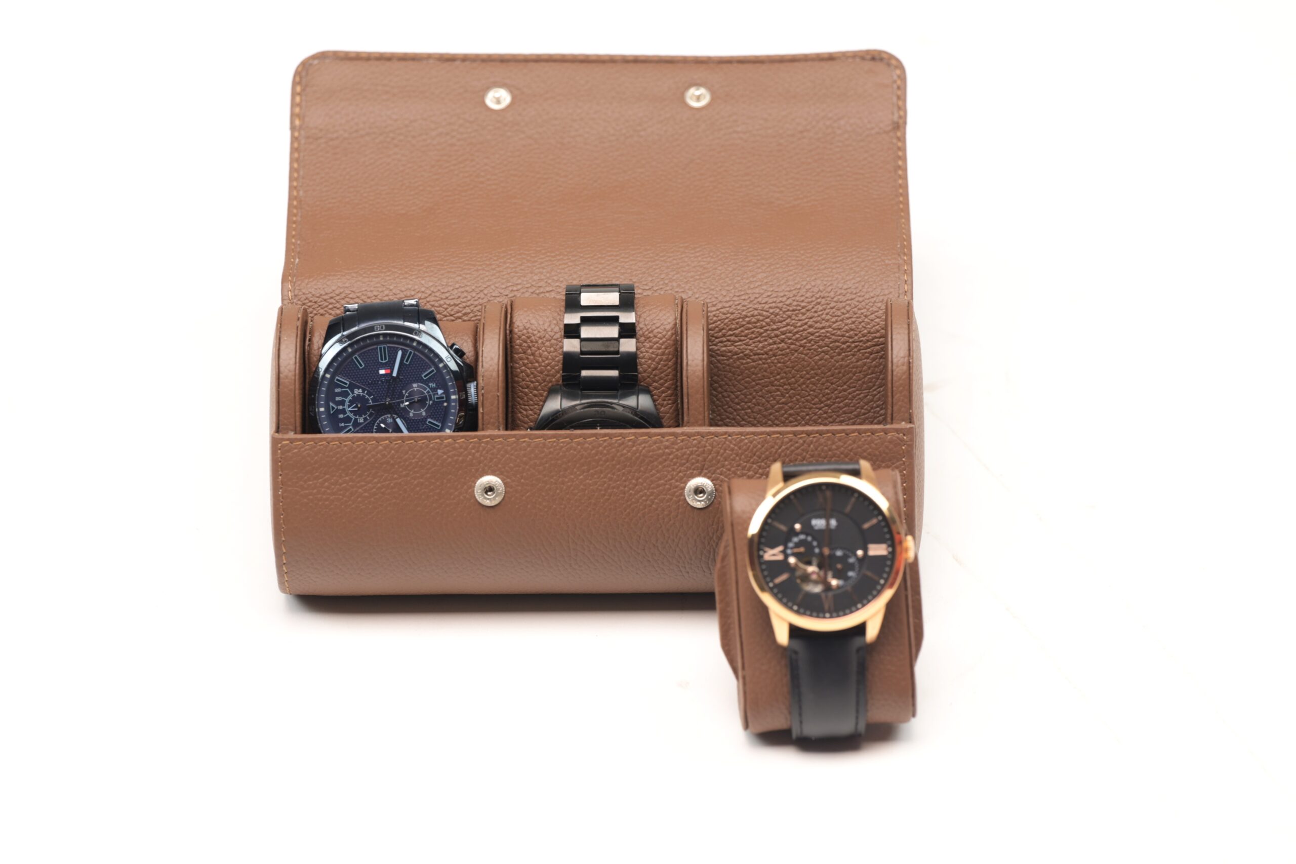 Elegant cow leather watch case with three padded slots and secure gunmetal snap closure.