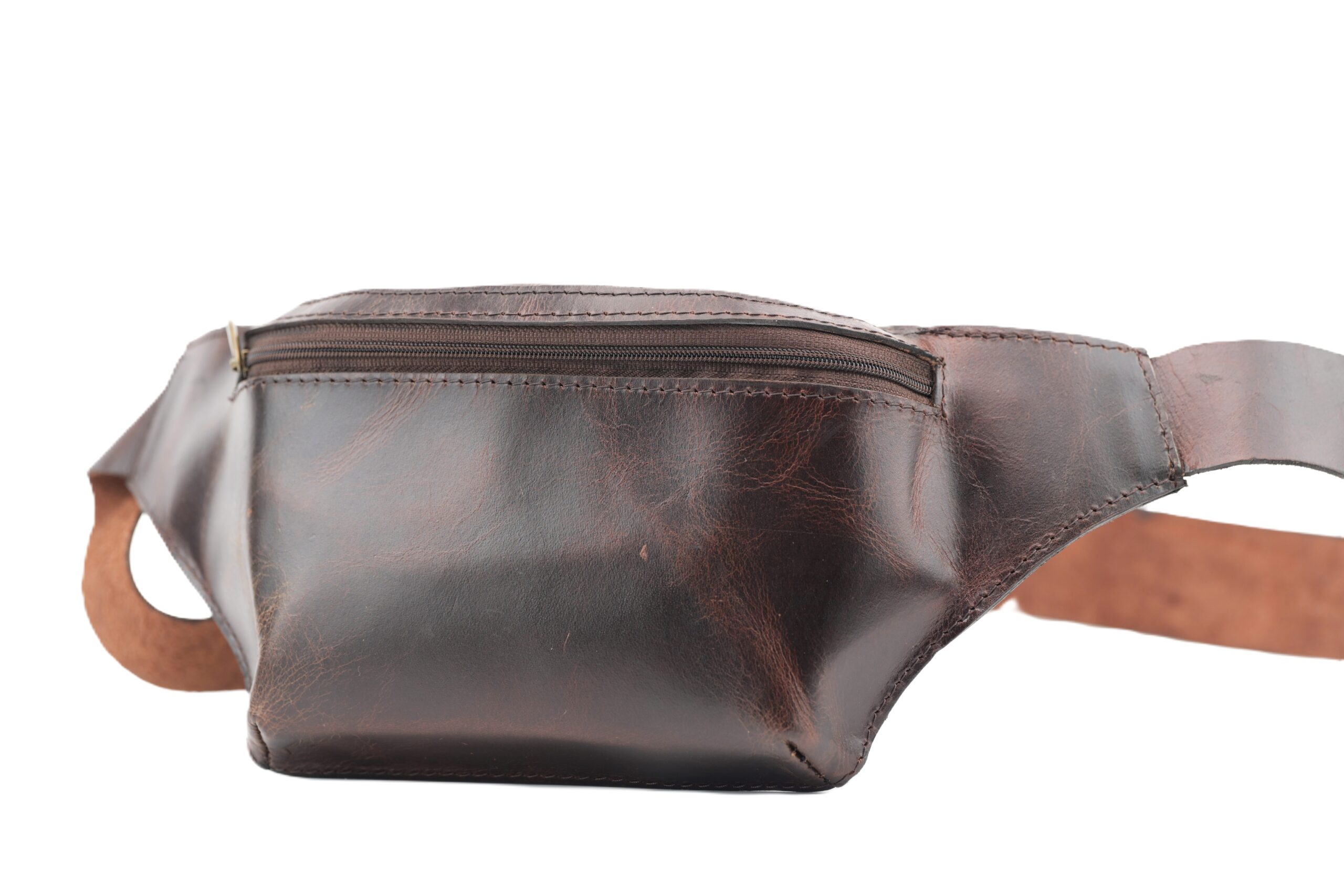 Sleek full-grain buffalo leather waist bag with adjustable strap and secure YKK zipper for hands-free convenience.