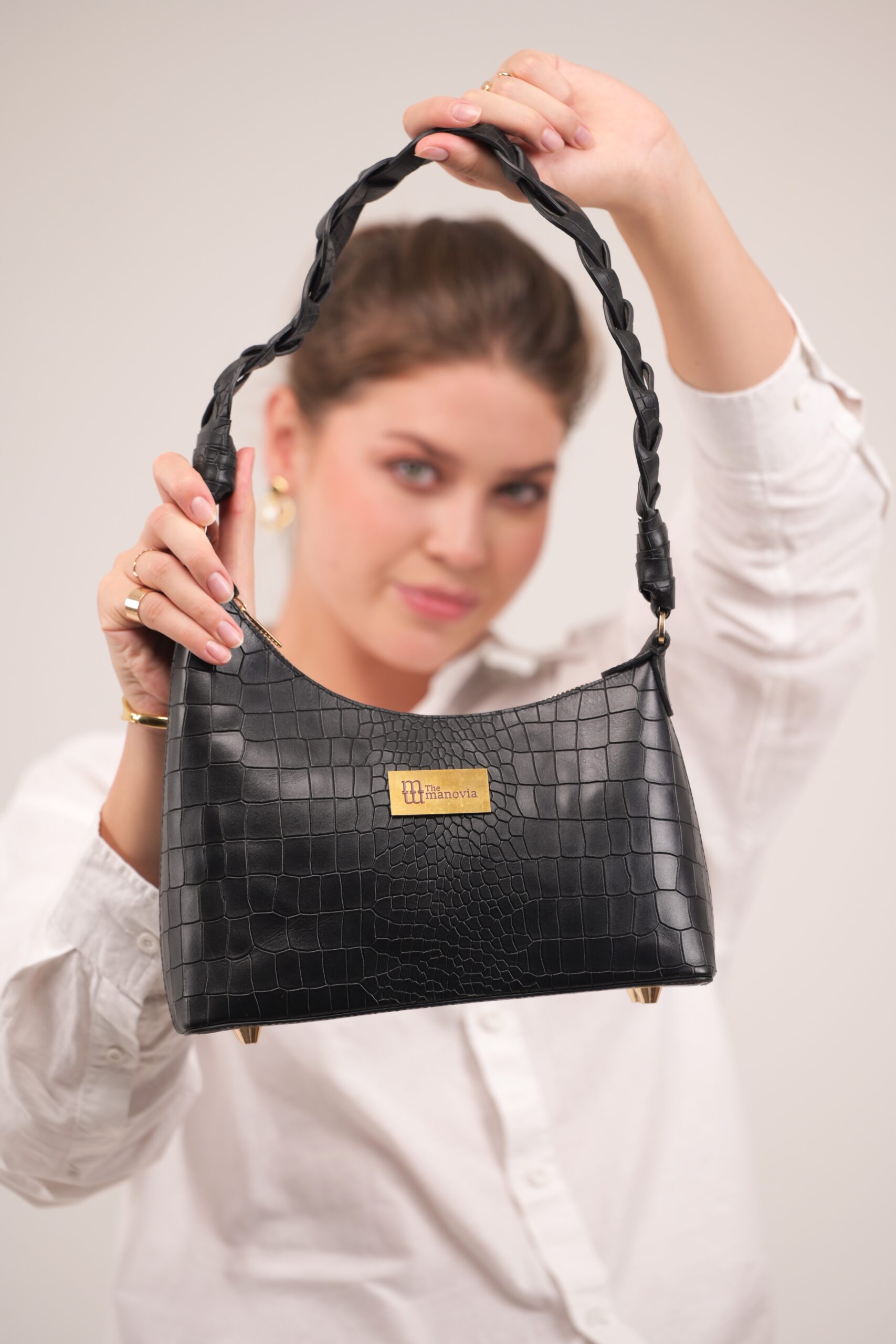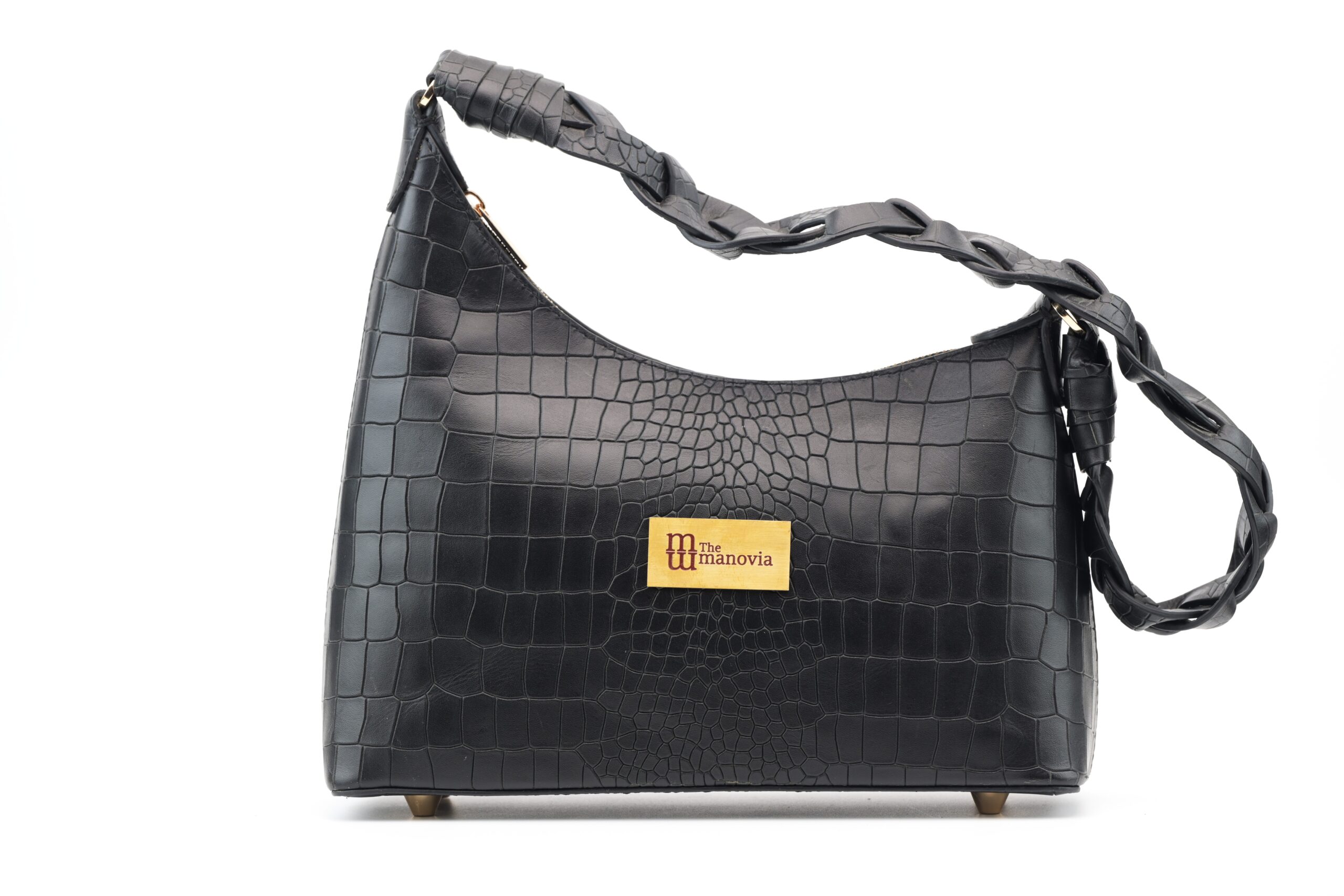 An understated symbol of elegance, this shoulder bag from The Manovia blends heritage craftsmanship with a refined, modern silhouette. Crafted from full grain vegetable-tanned cow leather, its black croc-textured surface offers depth and character, designed to develop a graceful patina over time. The gently rounded form and streamlined detailing make it a versatile companion for both intimate gatherings and leisurely afternoons.