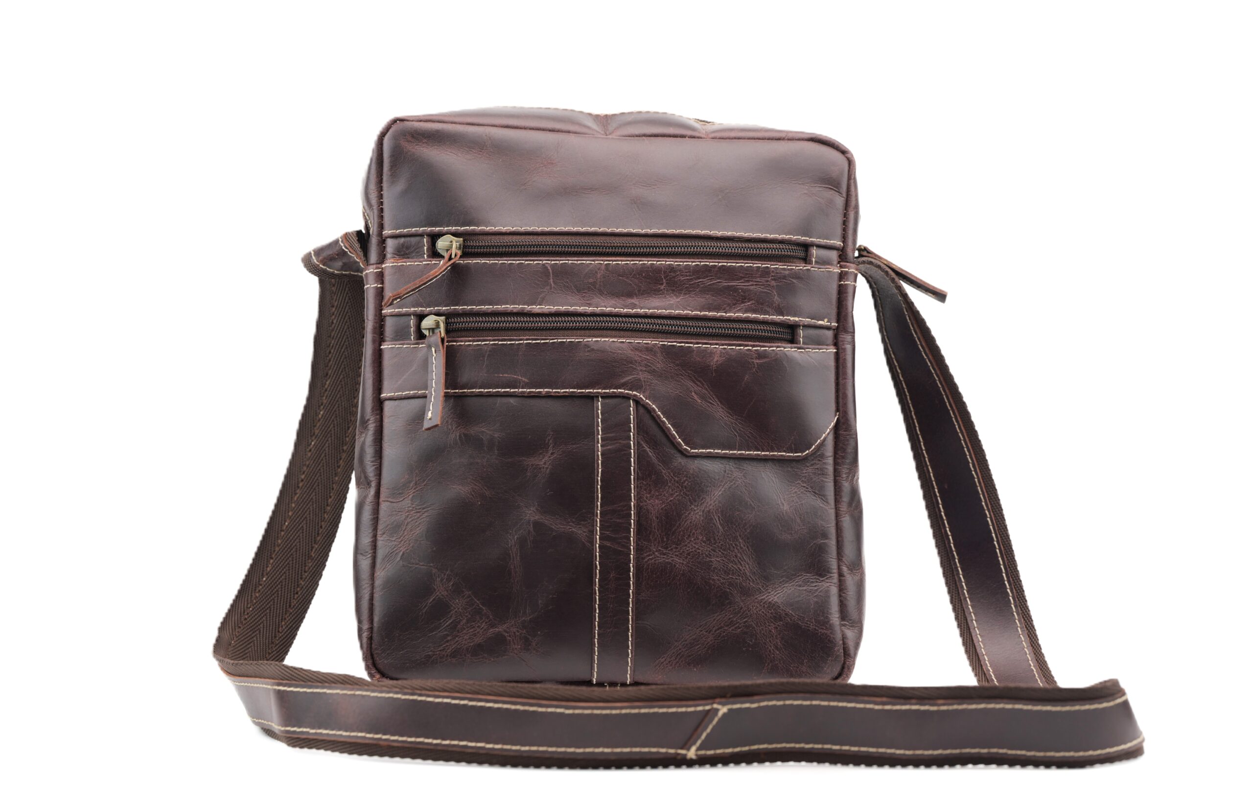 Distressed buffalo leather messenger with organised compartments for professional daily carry.