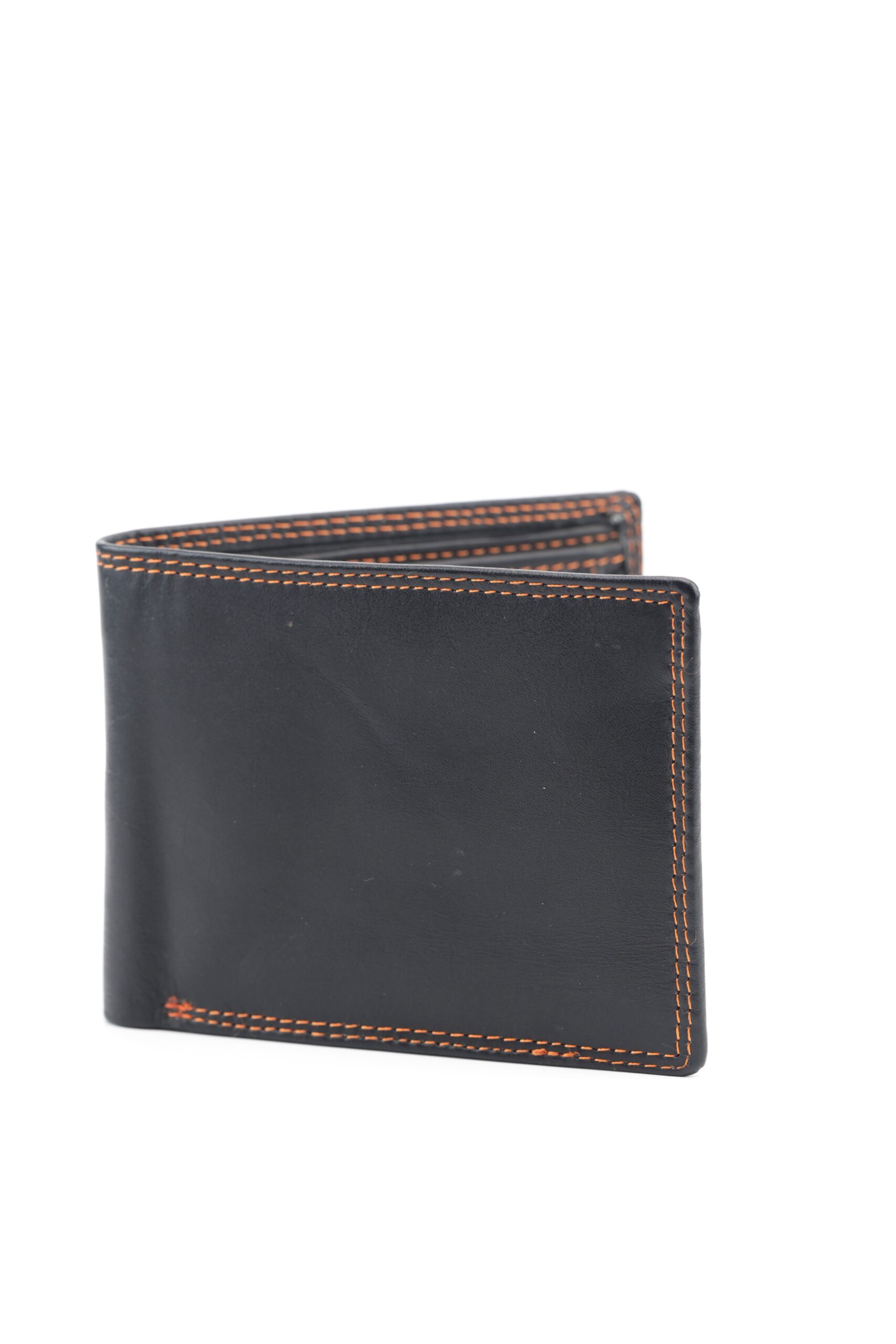 Compact and organised, this premium black cow leather trifold wallet offers multiple card slots, a clear ID window, and a secure snap-button coin pouch.